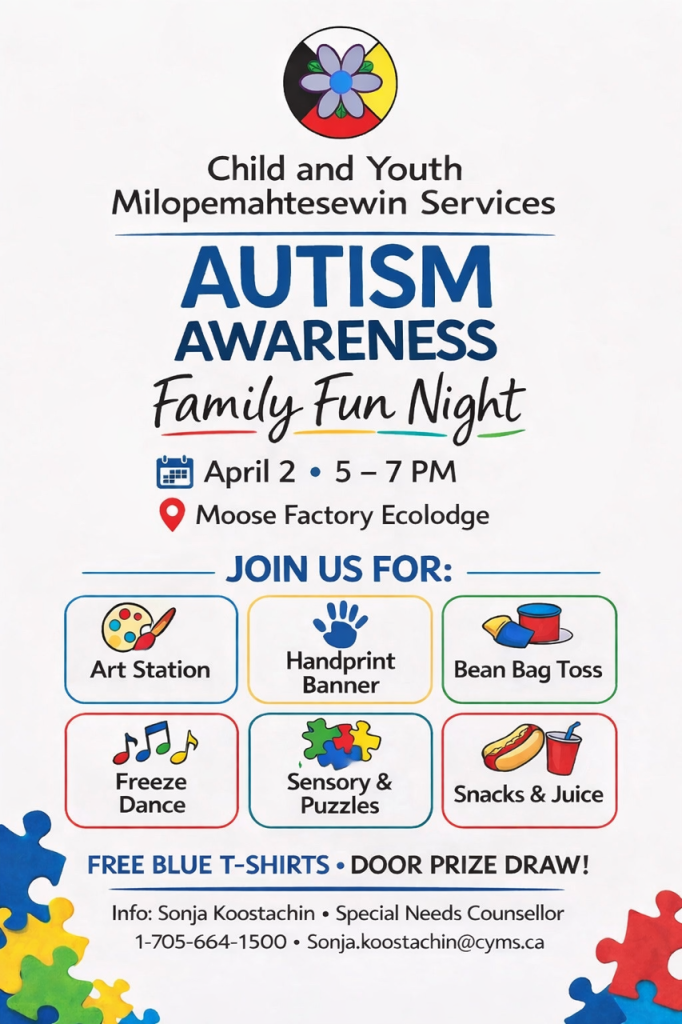 February 11, 2026For more information contact Sonja Koostachin, Special Needs Counsellor: sonja.koostachin@cyms.ca or 1-705-664-1500
